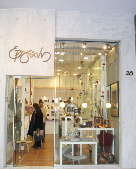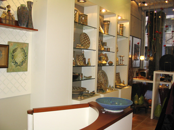 Interior design for a shop that sells handmade objects and mostly ceramics from various artists.